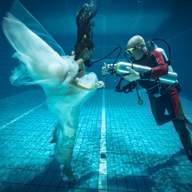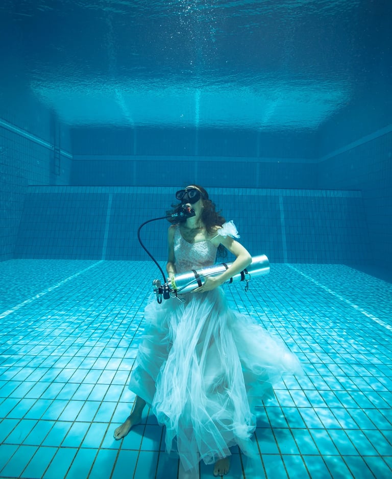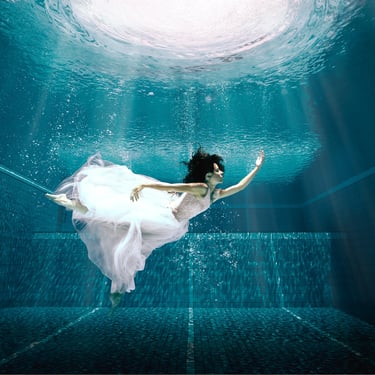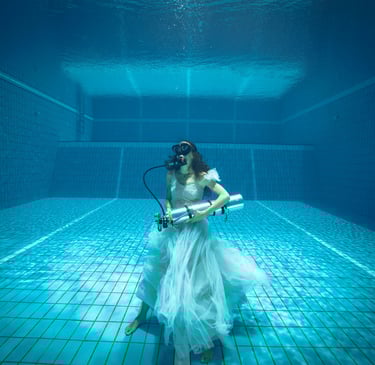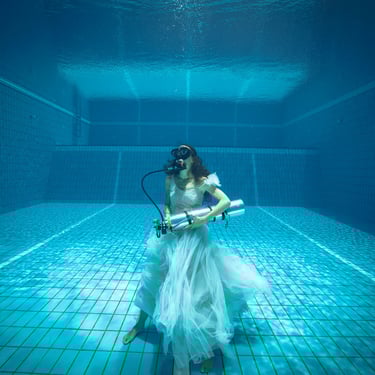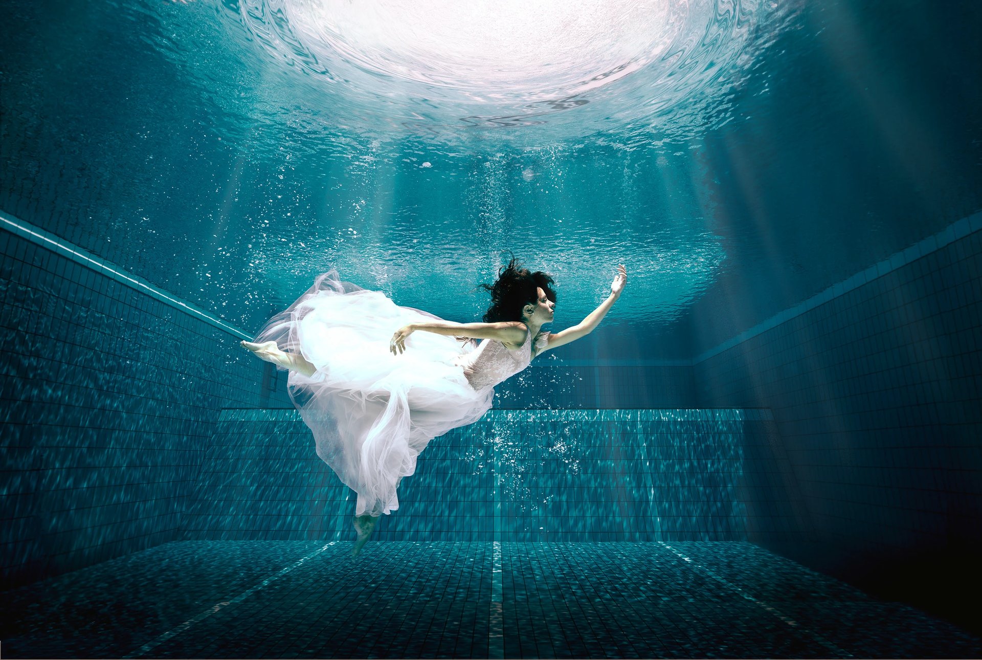 Il concept visivo ha puntato su uno scatto onirico e surreale: una ragazza in abito lungo da sposa, in posa plastica da danza, immersa nella piscina termale come se fluttuasse in un sogno. L’immagine mette in scena la fusione tra benessere acquatico e leggerezza estetica, evocando emozione ed esclusività.